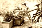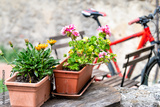 Badno Vignoni, Italy in Tuscany with closeup of flower pots in garden with bicycle in small town village stone wall and plants