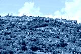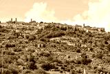 Montalcino skyline and Italy Val D'Orcia countryside in Tuscany hilltop small town village cityscape in summer green trees