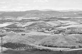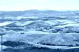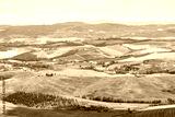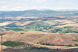 Val D'Orcia aerial countryside view in Tuscany, Italy with rolling plowed brown hills and villas with farm landscape picturesque meadow fields
