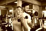 Portrait of Couple Love in Fitness Training With Dumbbell Equipment., Young Couple Caucasian are Working Out and Training Together in Gym Club., Sport and Healthy Concept.