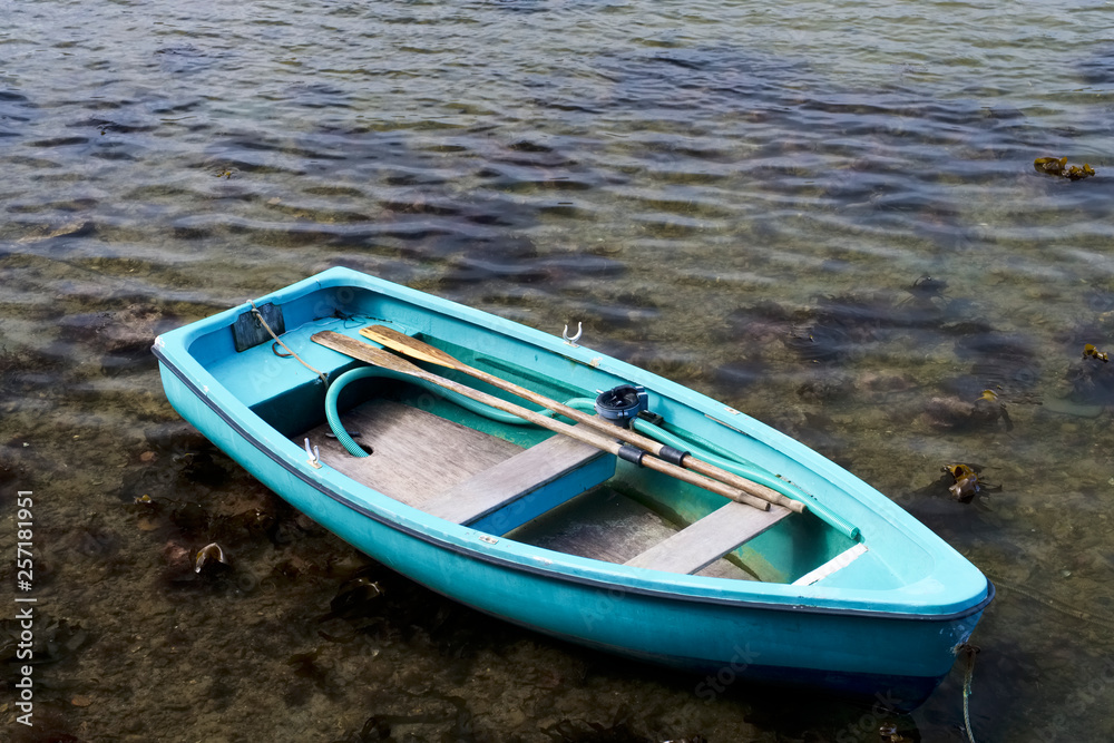 Turquoise rowing boat shallow clear sea water