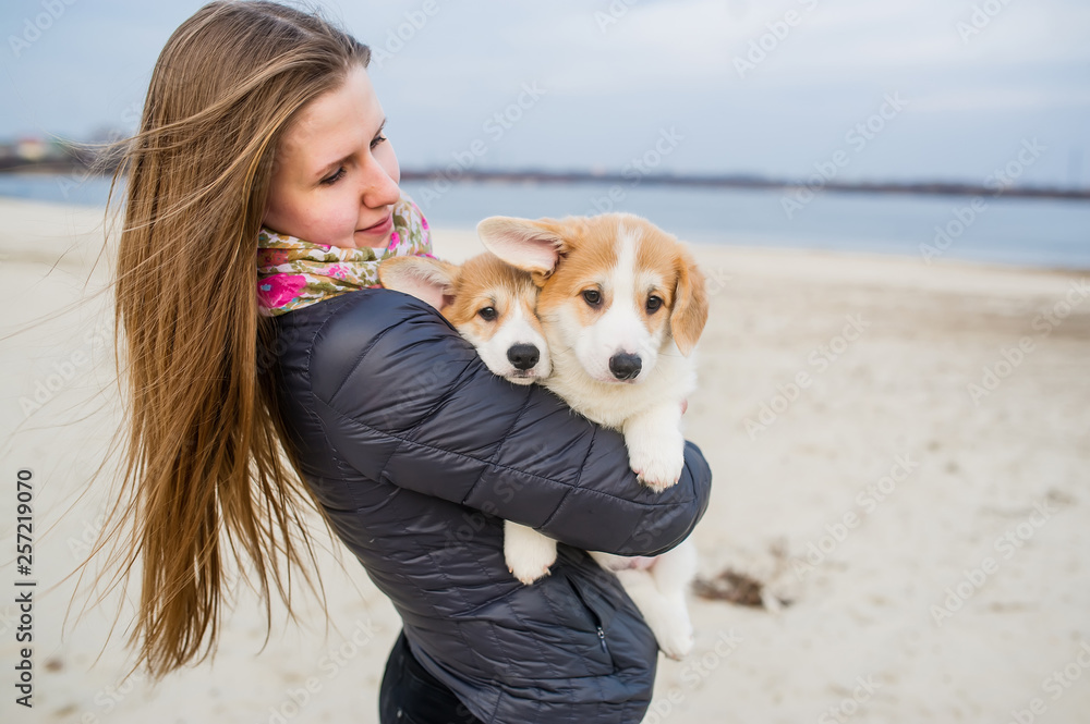 Two Welsh corgi pembroke puppies is in woman hands
