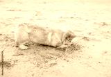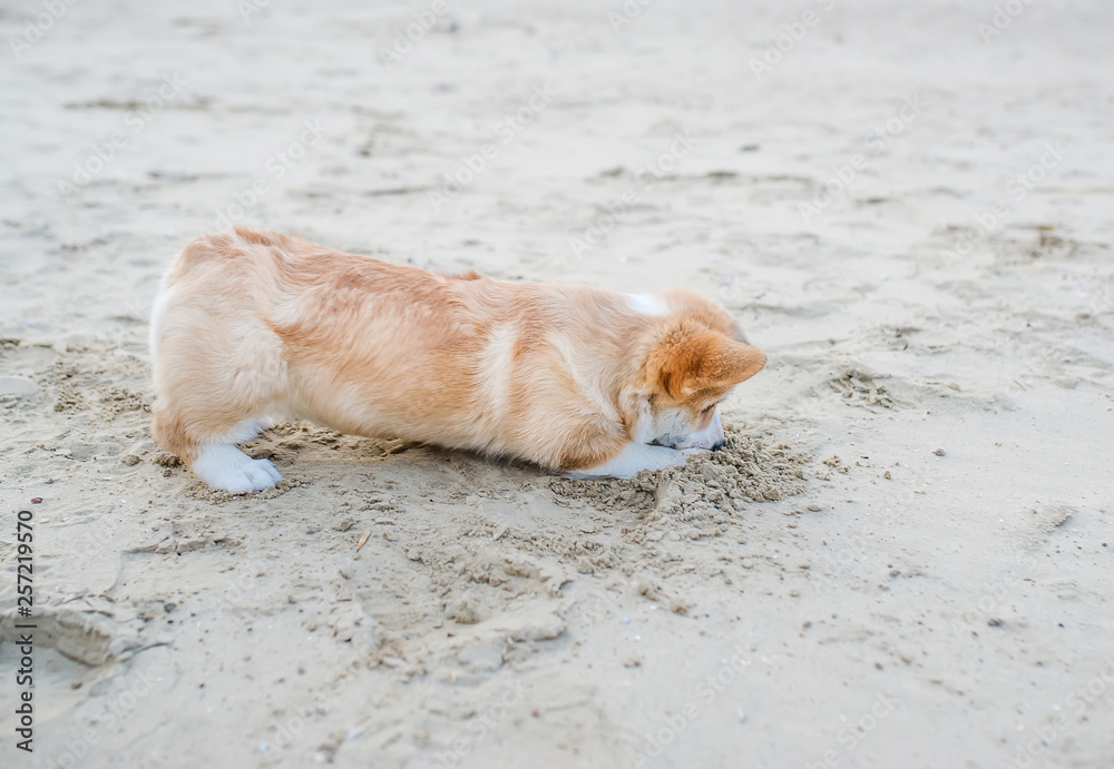 Welsh corgi pembroke puppy playing in the sandy beach.