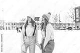 Happy girls rejoice in the winter at rink. They smile and laugh in the winter at the resort, on weekends at a public skating rink, in warm clothes and hats.