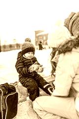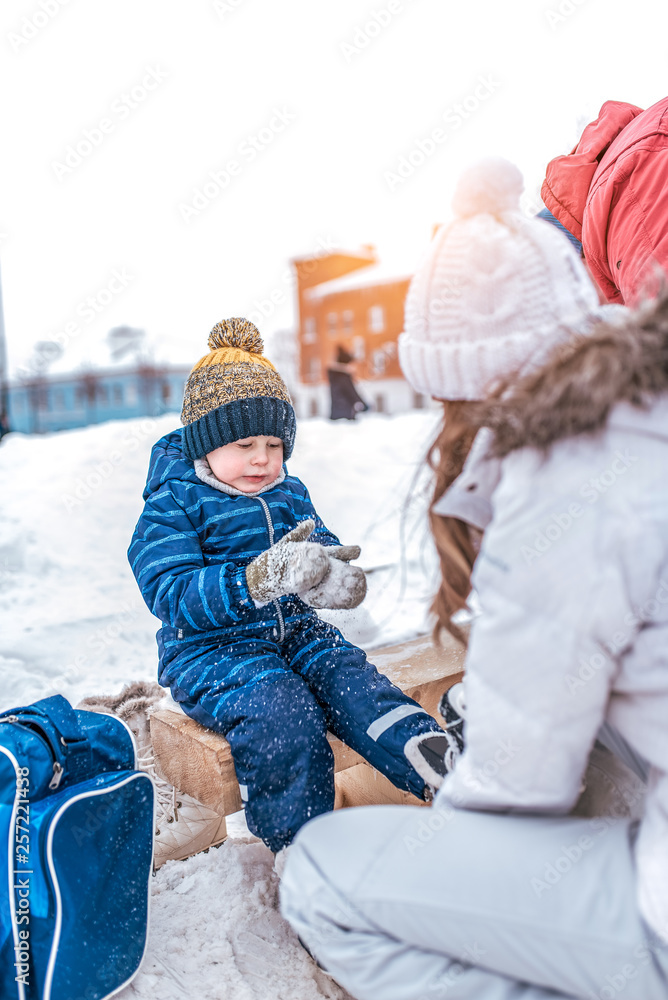 A small boy of 4-6 years old, sitting on a bench, in the winter in the city on the rink. Waiting for Mom to put on skates. On the cold day on weekends in January.