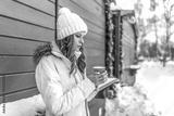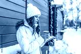 Beautiful girl warming up about red cup with hot coffee tea drink, winter outside. Resting resort weekend, free space for text. In white jacket and a warm hat on background of red windows.