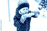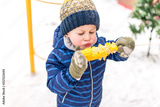 Little boy 4-5 years old, in winter in city in fresh air on background of snow. Blowing on hot boiled corn. Breakfast lunch and snacks on weekends on a cold festive day. In warm clothes and a hat.