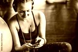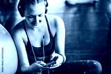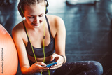 Young woman with earphones listening to music after hard workout in gym. Relax concept. Strength training and Body build up theme. Warm and cool tonePretty girl scrolling in her mobile phone. Close up