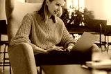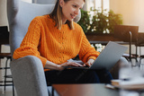 Happy smiling business woman working in modern loft, Beautiful woman using laptop in co-working space