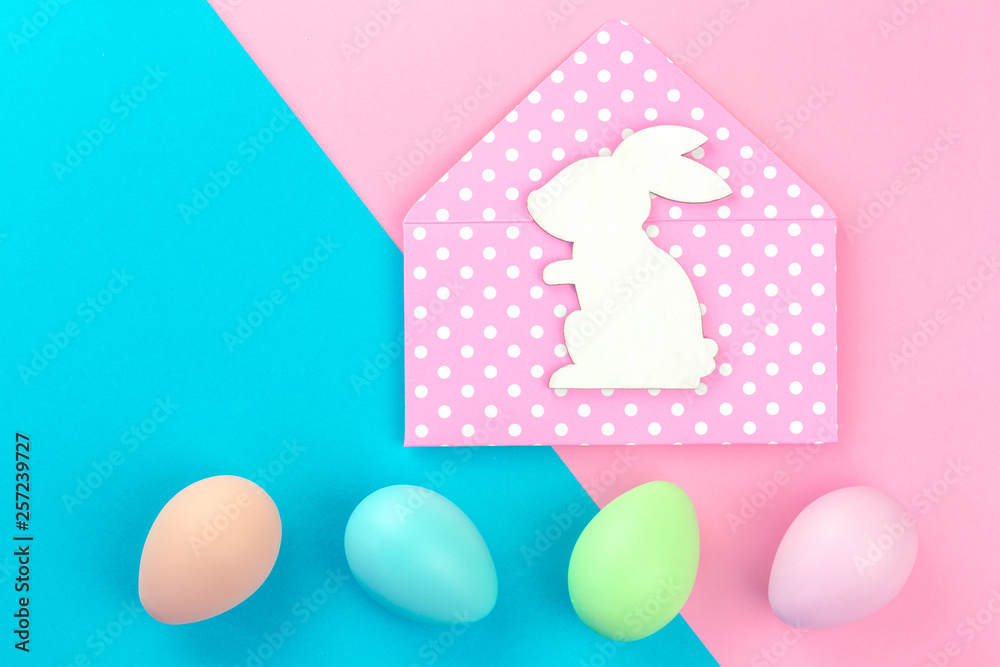 Colorful pastel easter eggs on pink and blue background with white cut out bunny on an envelope with polka dot pattern