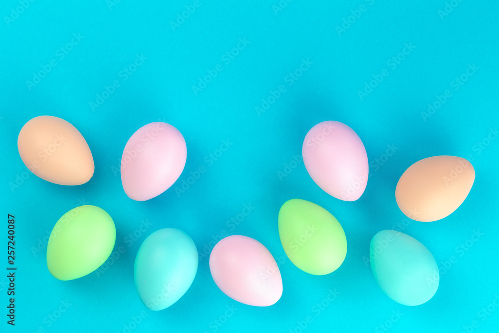Colorful tender spring pastel easter eggs lined on blue background in flat lay with copy space