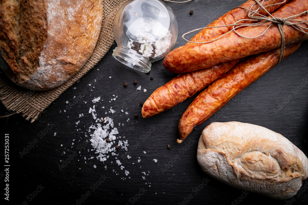 Traditional smoked sausage. A portion of rural sausage on a chopping board.