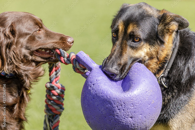 Golden Retriever and German Shepherd playing with a toy. Off-leash dog park in Northern California.