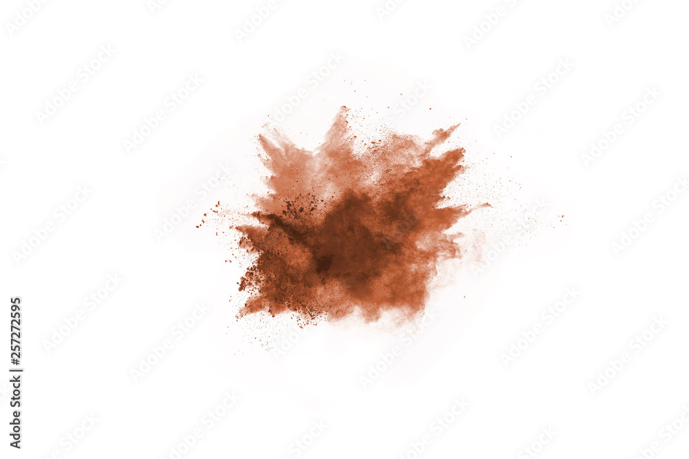 Brown color powder explosion on white background. Colored cloud. Colorful dust explode. Paint Holi.