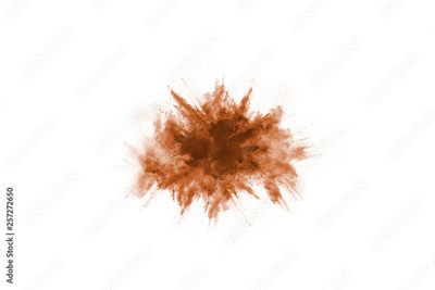 Brown color powder explosion on white background. Colored cloud. Colorful dust explode. Paint Holi.