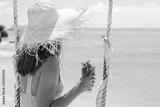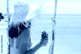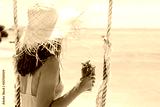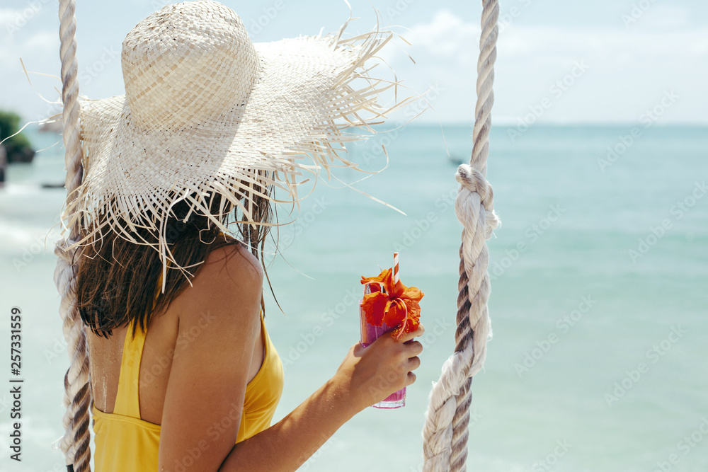Girl drinking cocktail and hangig on swings in beach cafe on tropical island