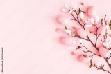 Easter composition. Easter eggs, pink flowers on pastel pink background. Flat lay, top view, copy space
