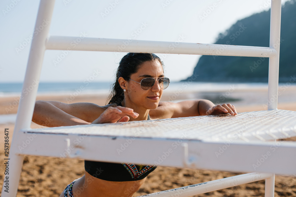 Fit young woman exercising at the beach. Summer healthy outdoor fitness workout.