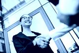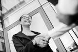 two young cute business women shaking hands. A successful transaction, contract, contract, business.
