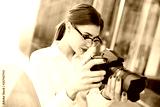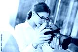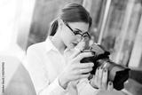 beautiful young girl in white shirt holding in hands the camera presses the shutter button and looks into the viewfinder. Photography, photographer, paparazzi
