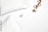 Soft white quilted pillow and branch of cotton on light background top view. Clean pillow, interior item, bedding mockup design template