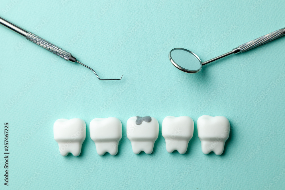 Healthy white teeth and tooth with caries on green mint background and dentist tools mirror, hook.