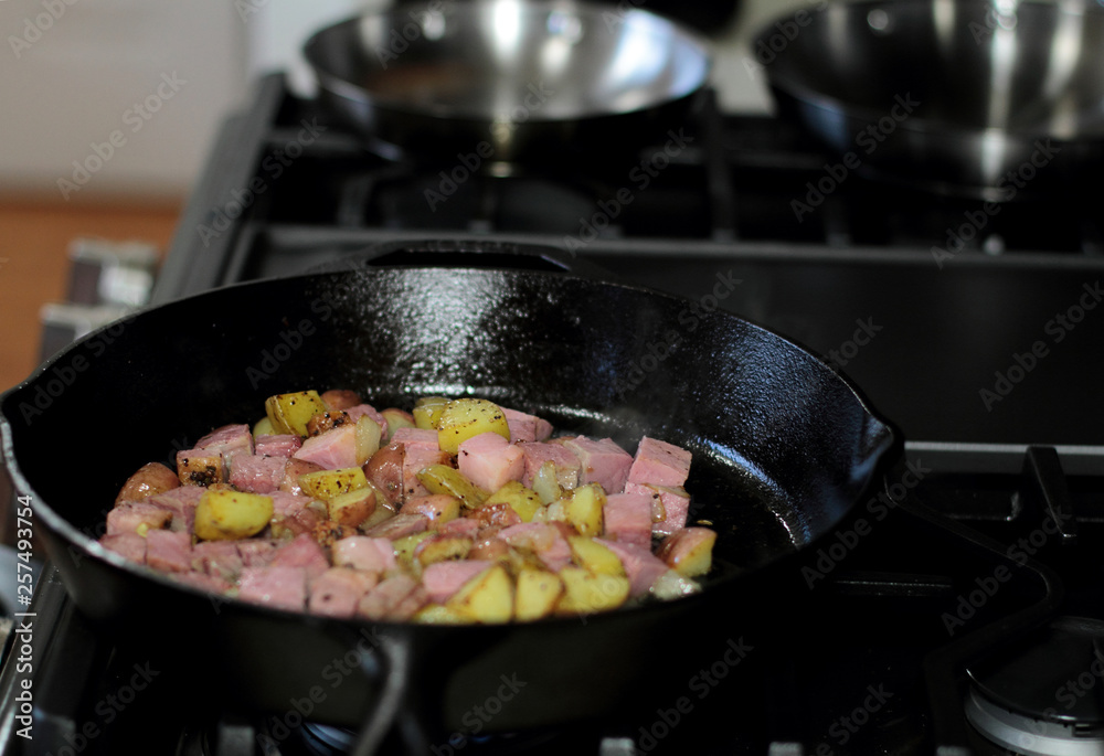 Corned beef hash cooking in a cast iron pan.