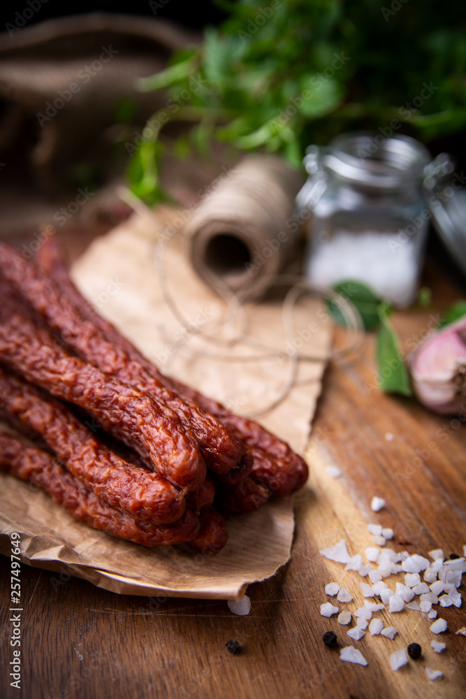 Dry sausage. Smoked sausages. Country sausage, homemade sausage.