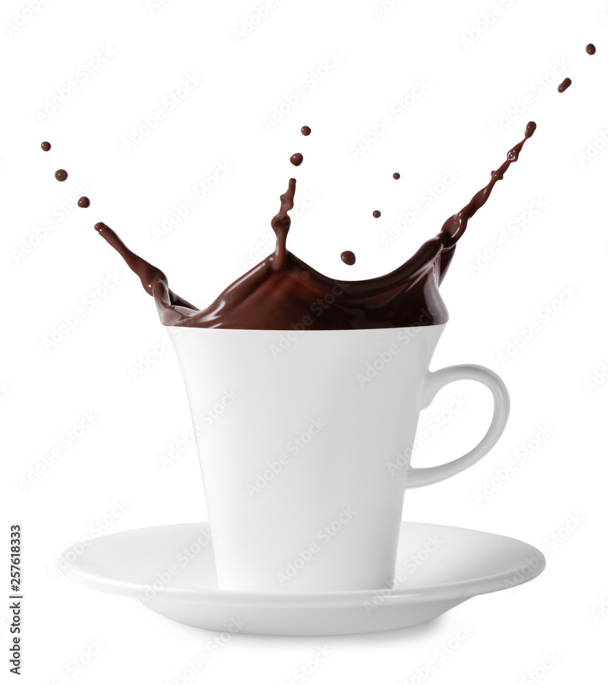 Splash of black chocolate in white cup with saucer