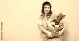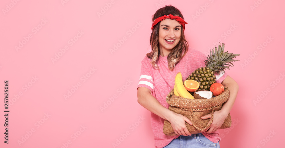 Portrait of a girl with a bag with fruit isolated on a pink background