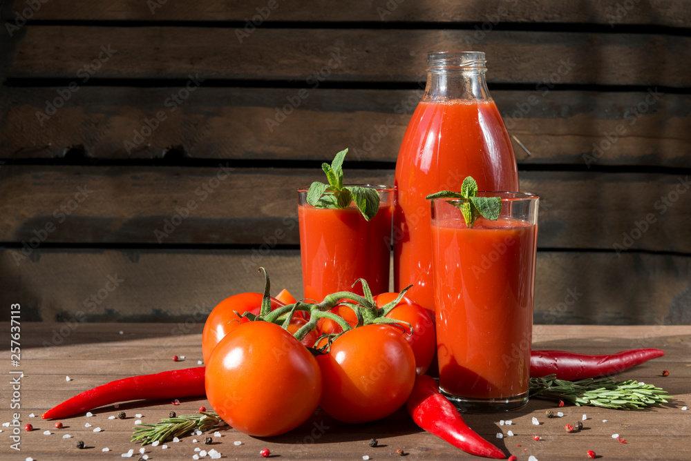 red fresh tomatoes, tomato juice in glass and bottle, pepper, mint, rosemary, spices, on wooden background