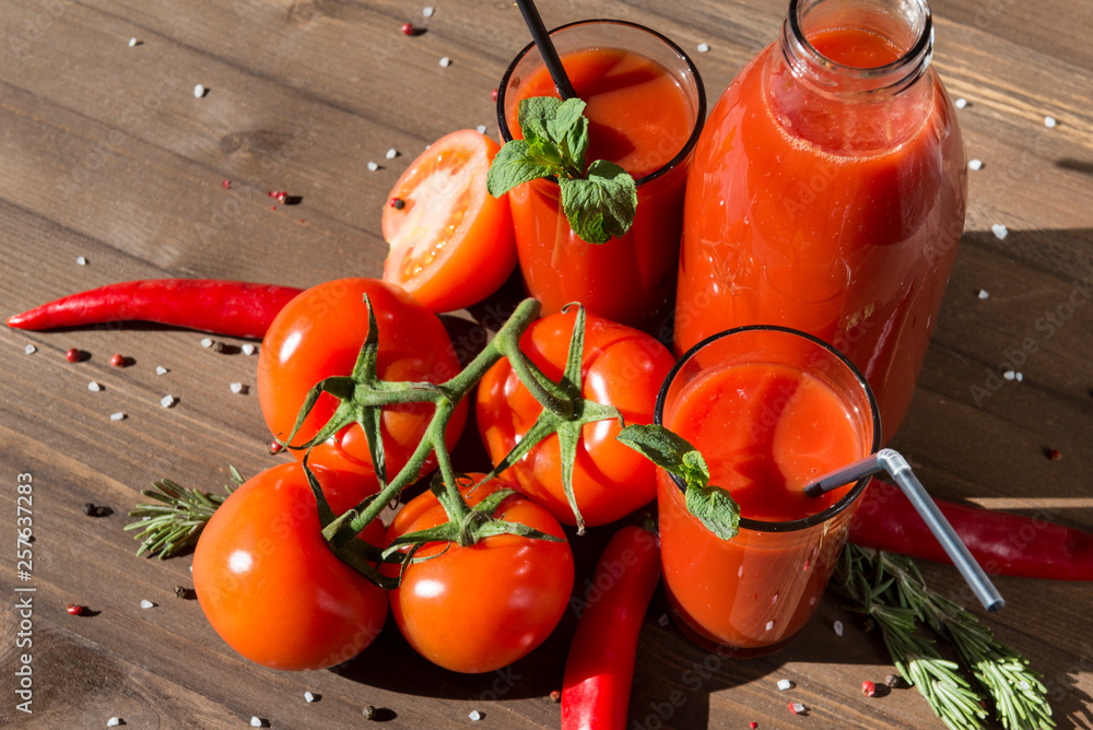 cups tomato juice with mint and straw, juice bottle, fresh red tomatoes, chili pepper, rosemary
