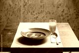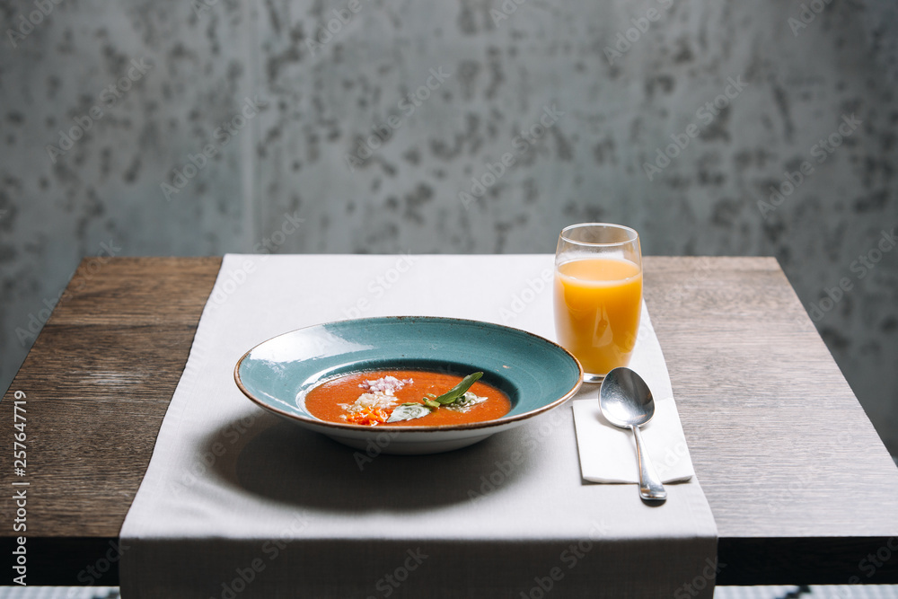 Traditional spanish cold tomato soup gazpacho with orange juice. Salade de polvo