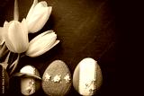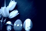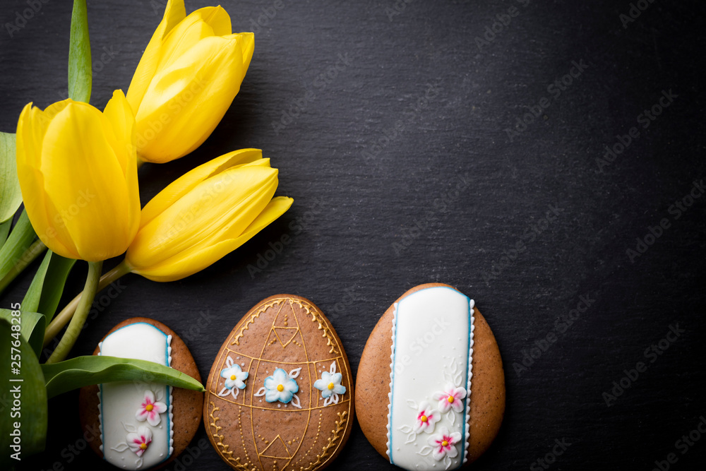 Easter background. Cookies and flowers on a black background.