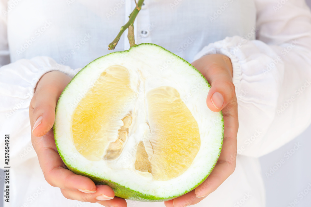 Woman holding healthy pomelo fruit.