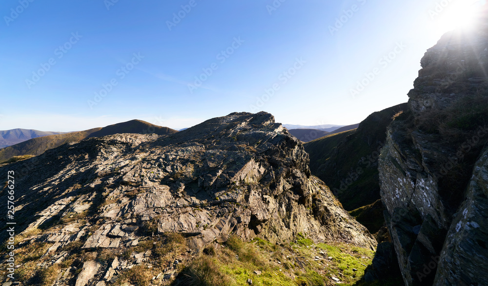 Looking over the rocky ridge below Hopegill Head towards Grisedale Pike on a sunny day in the English Lake District, UK.