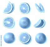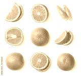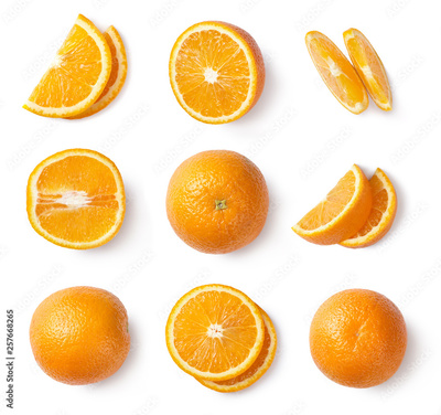 Orange slices, whole orange, half of orange isolated on white background. Top view.