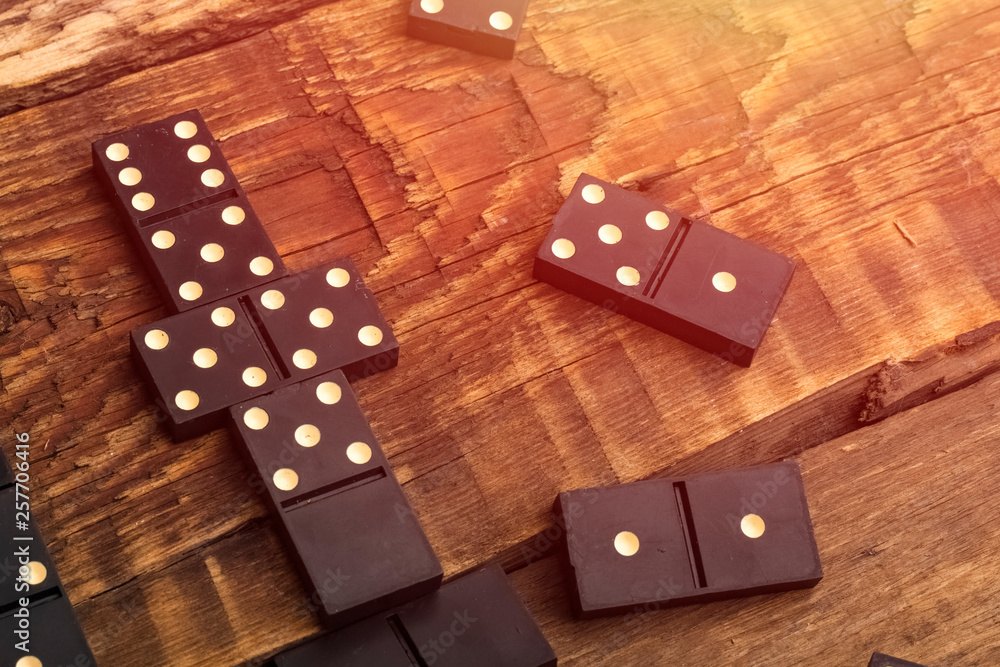 Playing dominoes on a wooden table. Domino effect. Copy space