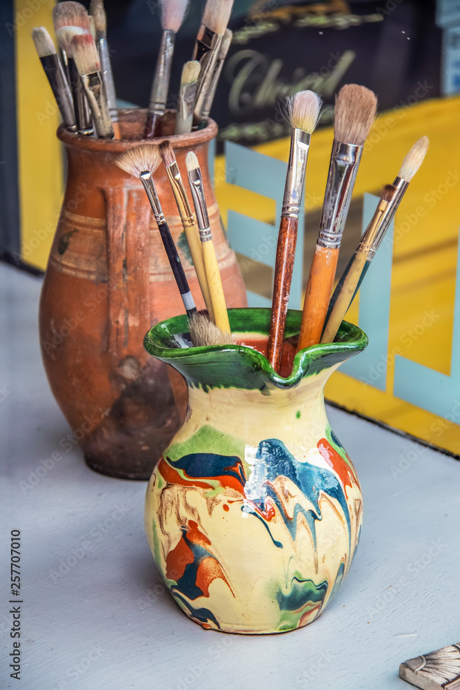 Two hand-made ceramic containers full of art paint brushes sitting on white surface with color blocking behind - selective focus