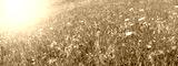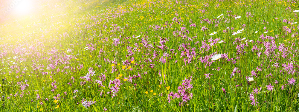 Blumenwiese mit Frühlingsblumen und Sonnenstrahlen