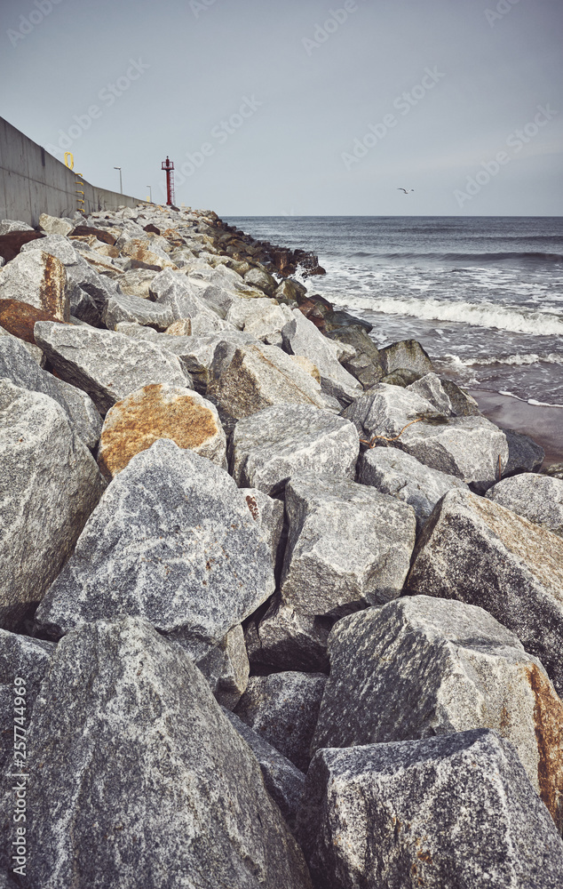 Boulder stones by a quay, color toning applied.