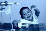 A happy toddler holding a plastic toy in hand while playing with educational toys that help develop creative thinking or imagination.