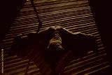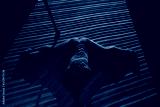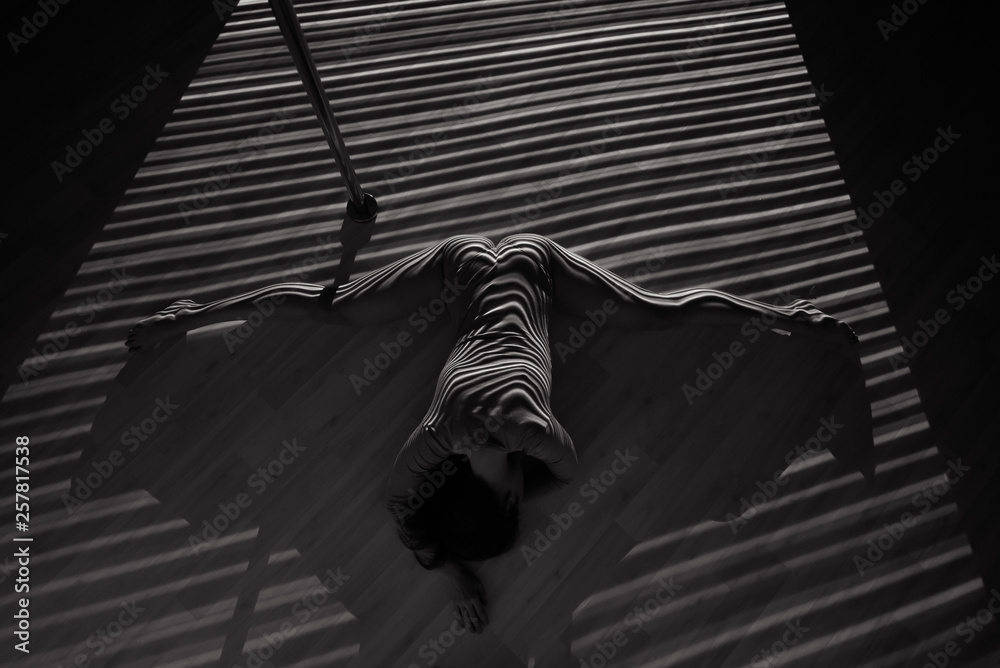 A beautiful woman dancing at the pole in the light of the projector. Young sexy slim woman doing splits
