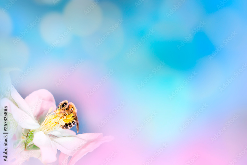 Spring pink background with blossom flowers and bee.Space for text presentation