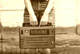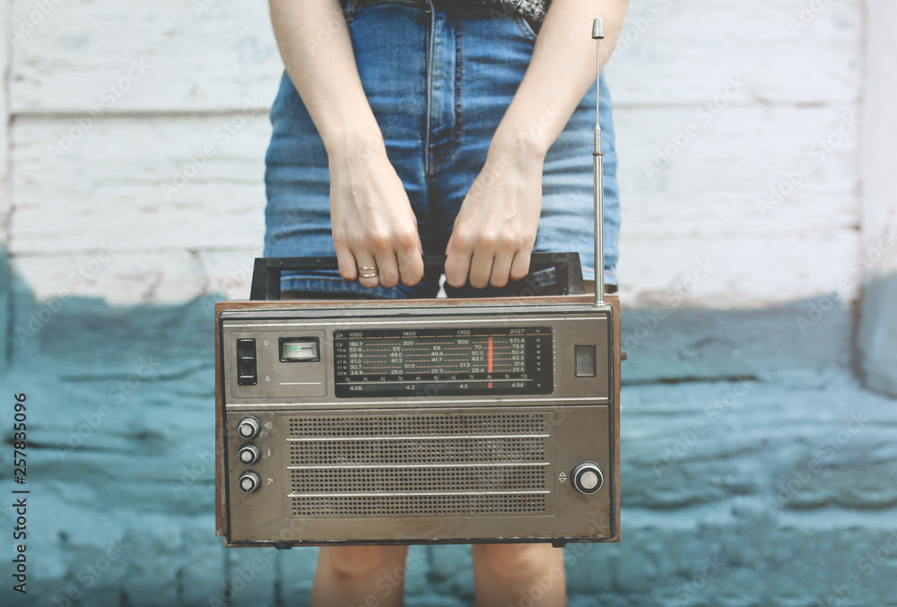 Hipster girl in denim jeans shorts is holding retro radio in hands. Style concept. Vintage music on wooden background. Modern technologies outdoors.