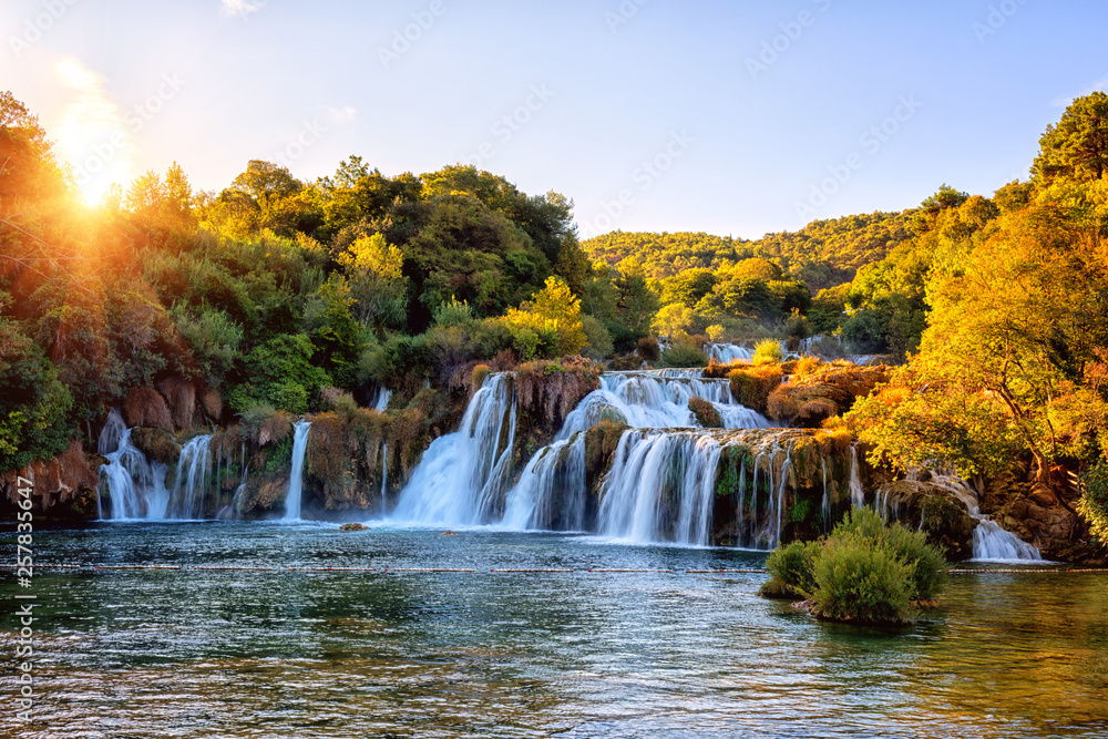 Amazing nature landscape, beautiful waterfall at sunrise, famous Skradinski buk, one of the most beautiful waterfalls in Europe and the biggest in Croatia, outdoor travel background