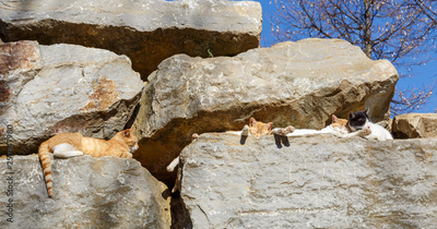 Gatos callejeros tumbados al sol. Parque urbano, León, España.