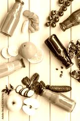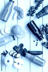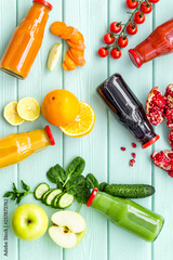 bottles with fresh carrot, tomato, apple, cucumber, lemon, pomegranate juices on wooden background top view copyspace