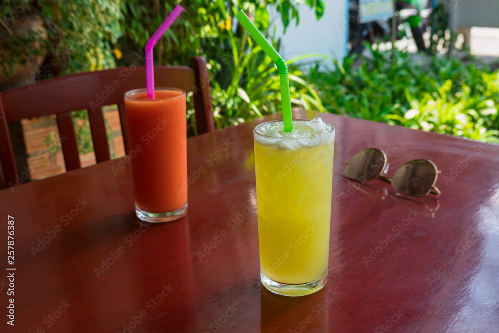 Two glasses of fruit smoothie, pineapple and tomato on a red table at cafe.