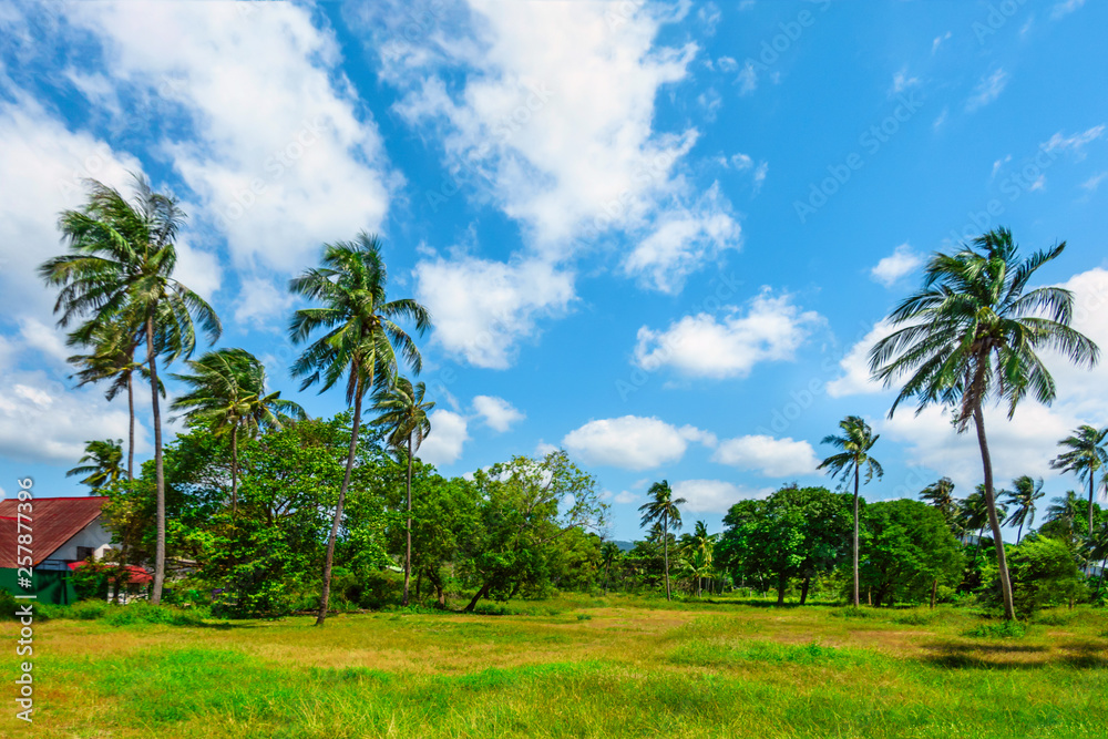 Beautiful palm trees with a lush crown against the sea and blue sky. Vacation concept.